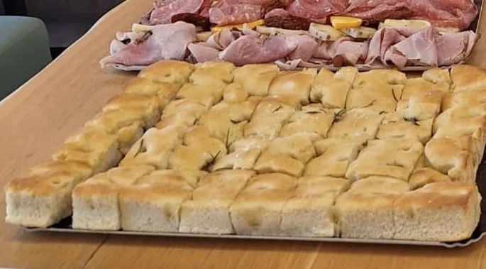 Focaccia pre-cortada en 32 cuadratitos, en bandeja y caja de cartón para Catering. Recomendada para 8/10personas