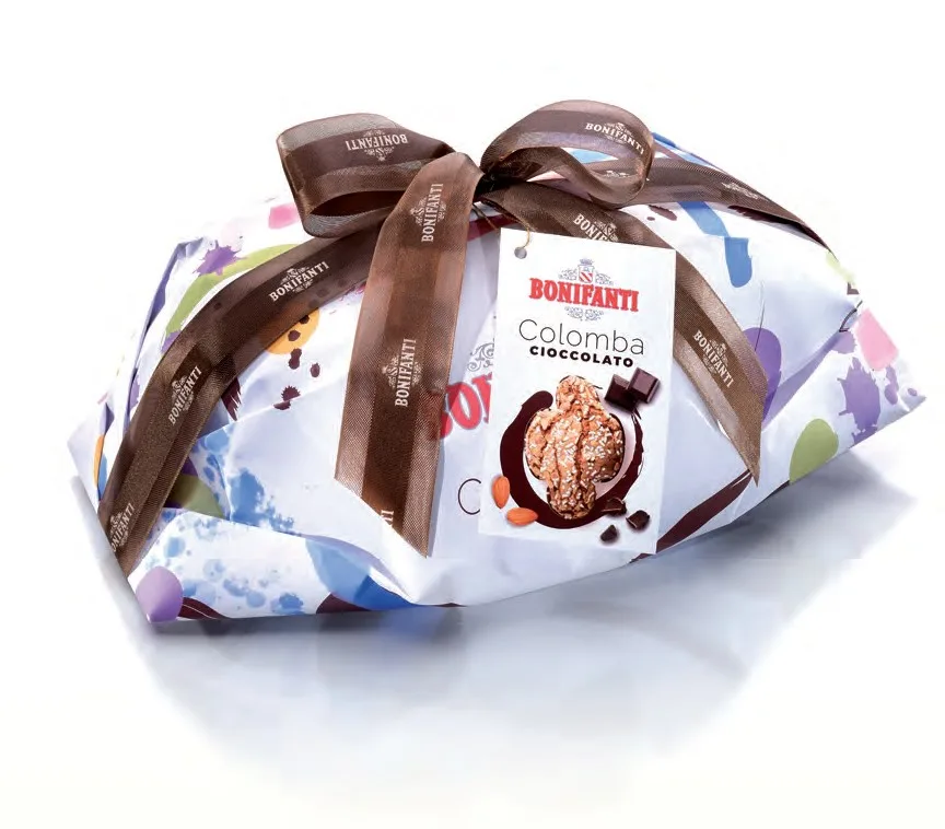 La Colomba de Pascua elaborada en el Obrador Artesanal de la Familia Bonifanti, rellena de chocolate, mantequilla de cacao, vainilla de Madagascar. Huevos camperos, mantequilla de granja, una cobertura con avellanas y almendras de Piemonte y la mítica Masa Madre Bonifanti, que constantemente renuevan y que es la base del “secreto” de su sabor y textura Confección Regalo para envolver 1000gr de un manjar que combina a la perfección el sabor de la masa Bonifanti con el chocolate y la vainilla, para disfrutar en familia de en la época de "Pasqua"