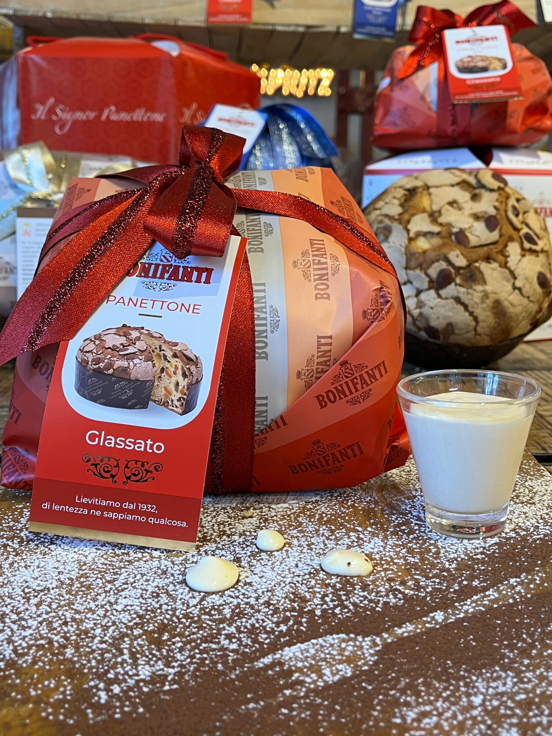Bonifanti crea según su receta original, masa madre, solamente mantequilla de granja, pasas y cáscaras de naranja confitada y cedro, el Panettone Artesanal Glaseado con la inconfundible capa exterior de avellanas y almendras enteras. Envuelto En Papel De Regalo.